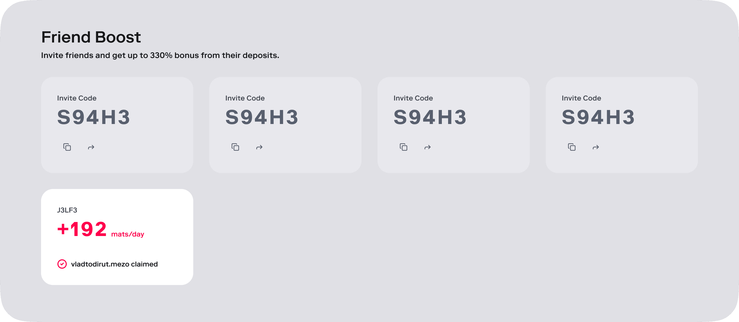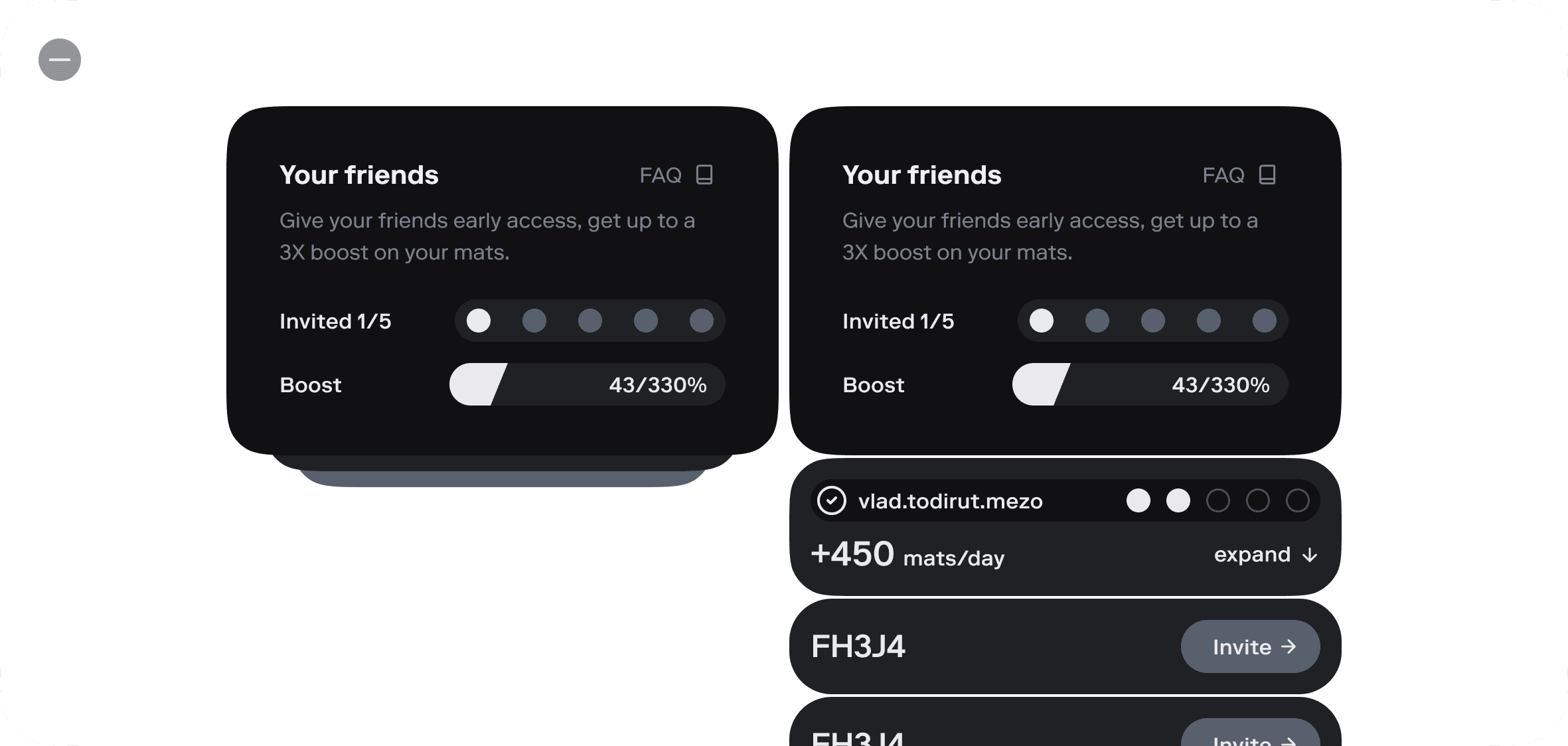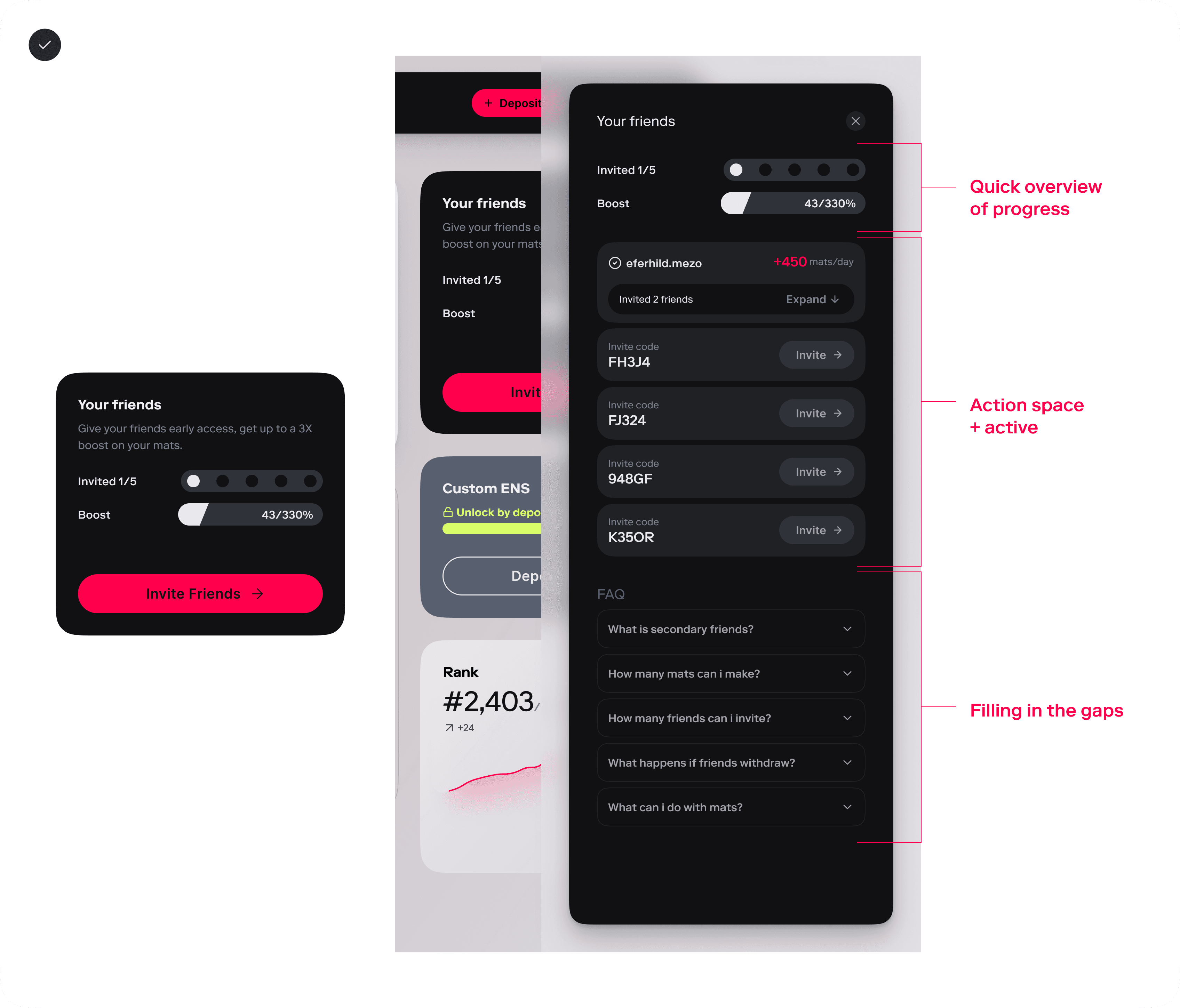 This is where an idea started to form, what if we split the screen in a main content section and a sidebar with actionable items. And this card would show how many you invited, what your current boost is and how far away you are from the goal. Also added an FAQ button for extra info.