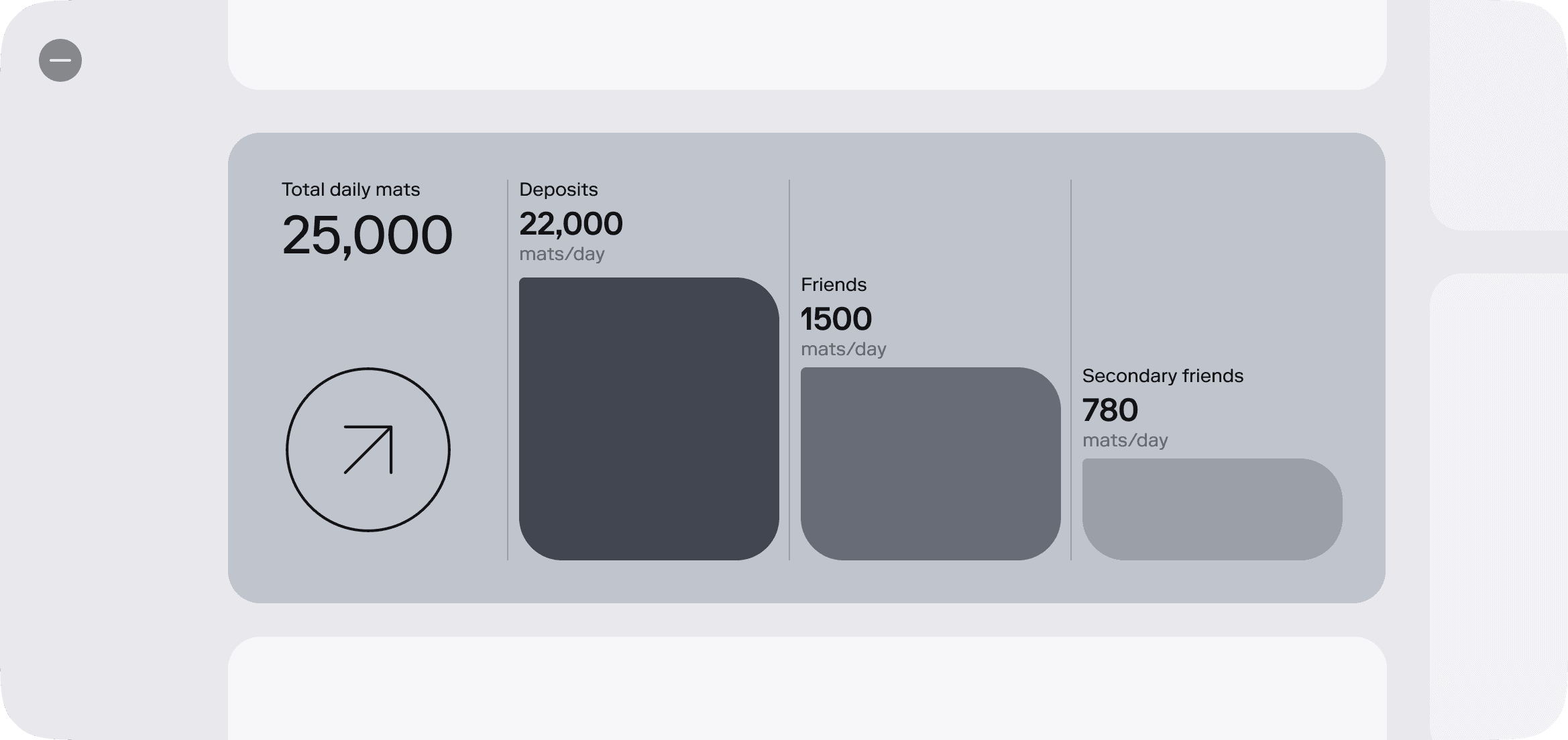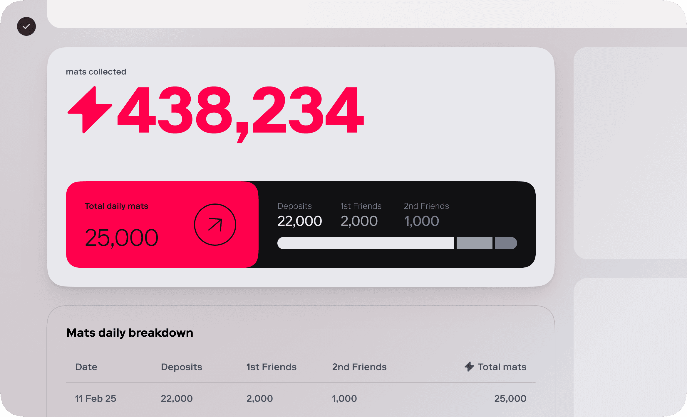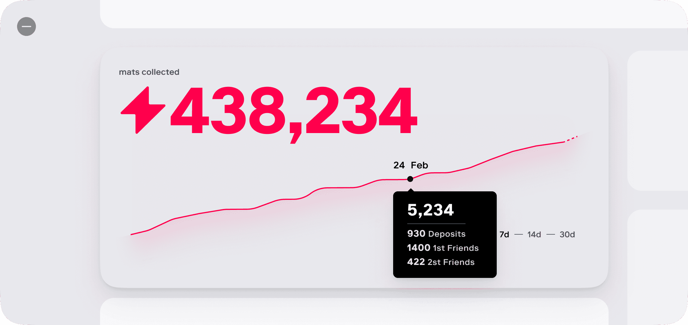To get things started and build early interest and brand equity, we launched a points program to incentivise and reward early participants. People could deposit real Bitcoin and receive virtual points in return, which we called “mats.”